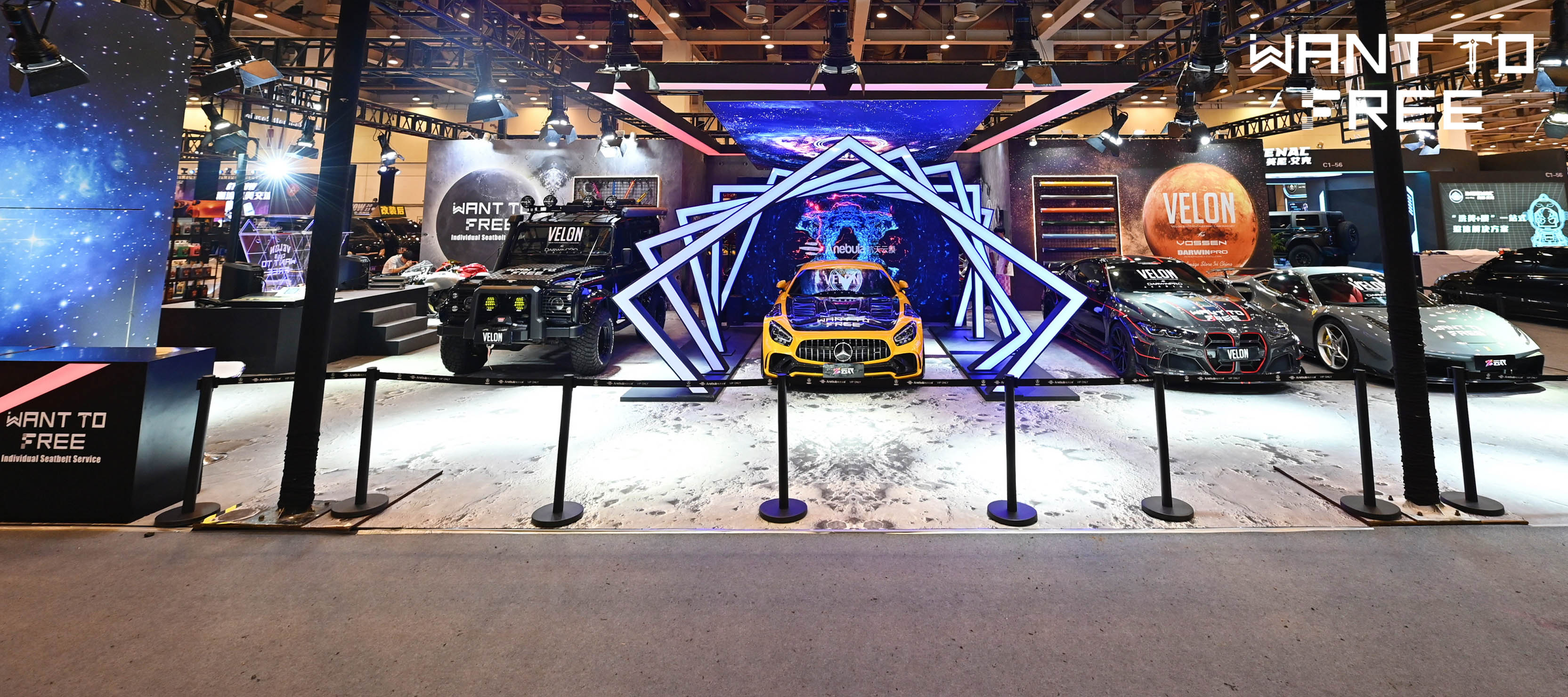 2023年GT SHOW汽车文化风尚秀已顺利落下帷幕,作为改装领域的新起之秀,WANT TO FREE个性化安全带的首秀为大众演绎了一场精彩绝伦的色彩艺术盛宴。展台整体设计以月球表面为主题,中间是蓝色的时光隧道引领观众通往浩瀚宇宙,地面呈现的是由行星撞击引发的月球表面凹凸坑与裂纹,真实渲染登录月球的体验感,给观众们带来强烈的视觉冲击。月球表面的“探险车”搭载观众抵达欢歌载舞的营地,与展示墙色彩斑斓的安全带交织出独特的艺术魅力。