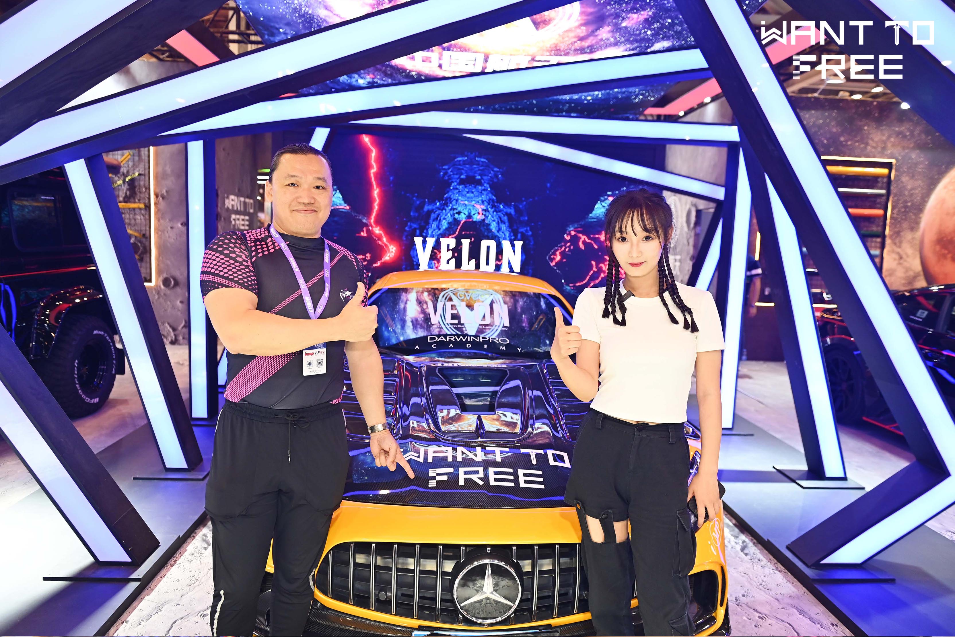 图8: WANT TO FREE创始人CEO胡奕与汽车KOL玩车女神宛如在展位合照。